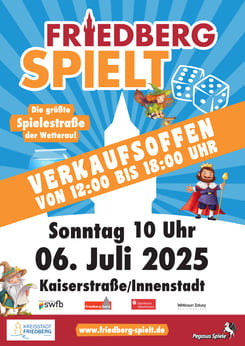Pegasus Spiele und die Stadt Friedberg laden zusammen mit den Kooperationspartnern Stadtwerke Friedberg, Sparkasse Oberhessen, Wetterauer Zeitung und uns, Friedberg hat's e.V., erneut zum Spielen auf der Kaiserstraße ein.