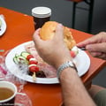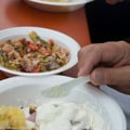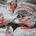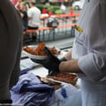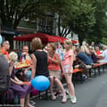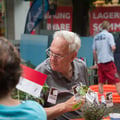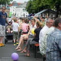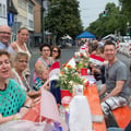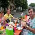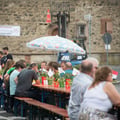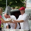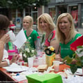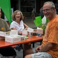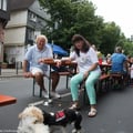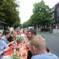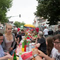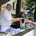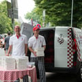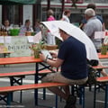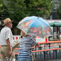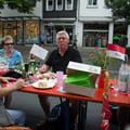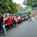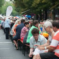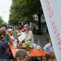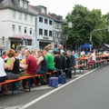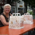Viele Teilnehmer hatten eine der sieben angebotenen Frühstücksvarianten vorbestellt. Alleine das Delikatus-Frühstück mit Ahle Worscht und Heumilchkäse war 160 Mal geordert worden. In grünen Tüten wurde dieses Frühstück an der westlichen Kaiserstraßen-Bushaltestelle ausgegeben. Alle Hände voll zu tun hatten Claudia Benthaus und ihr Team vom »Mama Lou’s«. Schön garniert auf Tellern wurden jeweils 50 vegetarische und 50 mediterrane Portionen ausgegeben. »Bei mir isst das Auge immer mit«, meinte die fünffache Mutter. Einer der ersten Besucher, die ihren vegetarischen Teller in Empfang nahmen, war Marco Steinhorst aus Steinfurth. »Ich bin vor dem Rosenfest geflohen«, meinte er lachend und suchte sich einen Platz an einem der 250 Tische, die gegen Mittag nahezu alle besetzt waren. Einige wenige Regentropfen sorgten kurz für einige Lücken, doch die große Mehrheit harrte aus und wurde belohnt: Wenig später kam kurz die Sonne hinter den Wolken hervor.