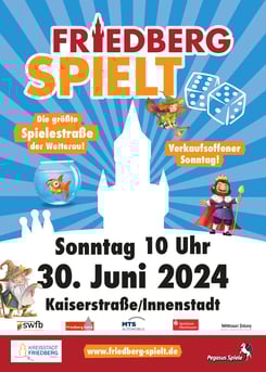 Die Stadt Friedberg lädt mit ihren vielen Vereinen und Institutionen, und in Zusammenarbeit mit Pegasus Spiele sowie Friedberg hat’s e.V., erneut zum Spielen ein. Am Sonntag, den 30. Juni, verwandelt sich die Kaiserstraße ein weiteres Mal in die längste Spielestraße der Wetterau. Groß und Klein können sich auf zahlreiche Spielaktionen und Aktivitäten bei den Gewerbetreibenden und Vereinen freuen.