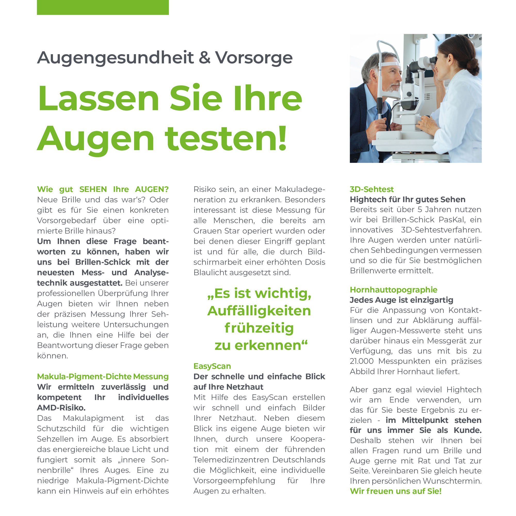 Brillenglasbestimmung (MKH) Präzisionsanpassung von Gleitsichtgläsern Hilfsmittelberatung für Sehbehinderte (Makuladegeneration, RP) Kontaktlinsenanpassung bei Kindern Kontaktlinsenanpassung bei Keratokonus Kontaktlinsenanpassung nach HH-Transplantation Kontaktlinsenanpassung bei Hornhautverkrümmung Brillenfassungen für Babys und Kleinkinder Sportbrillenberatung für alle Sportarten (Laufen, Rad fahren, Ski fahren, Tauchen, Schwimmen,Klettern, Wandern, Handball, Fußball, Basketball, Schulsport, …) Switch-it Premiumhändler Gleitsicht-Kontaktlinsen Visualanalyse / Visualtraining Blaufilterbrillen nach Cataract OP |
