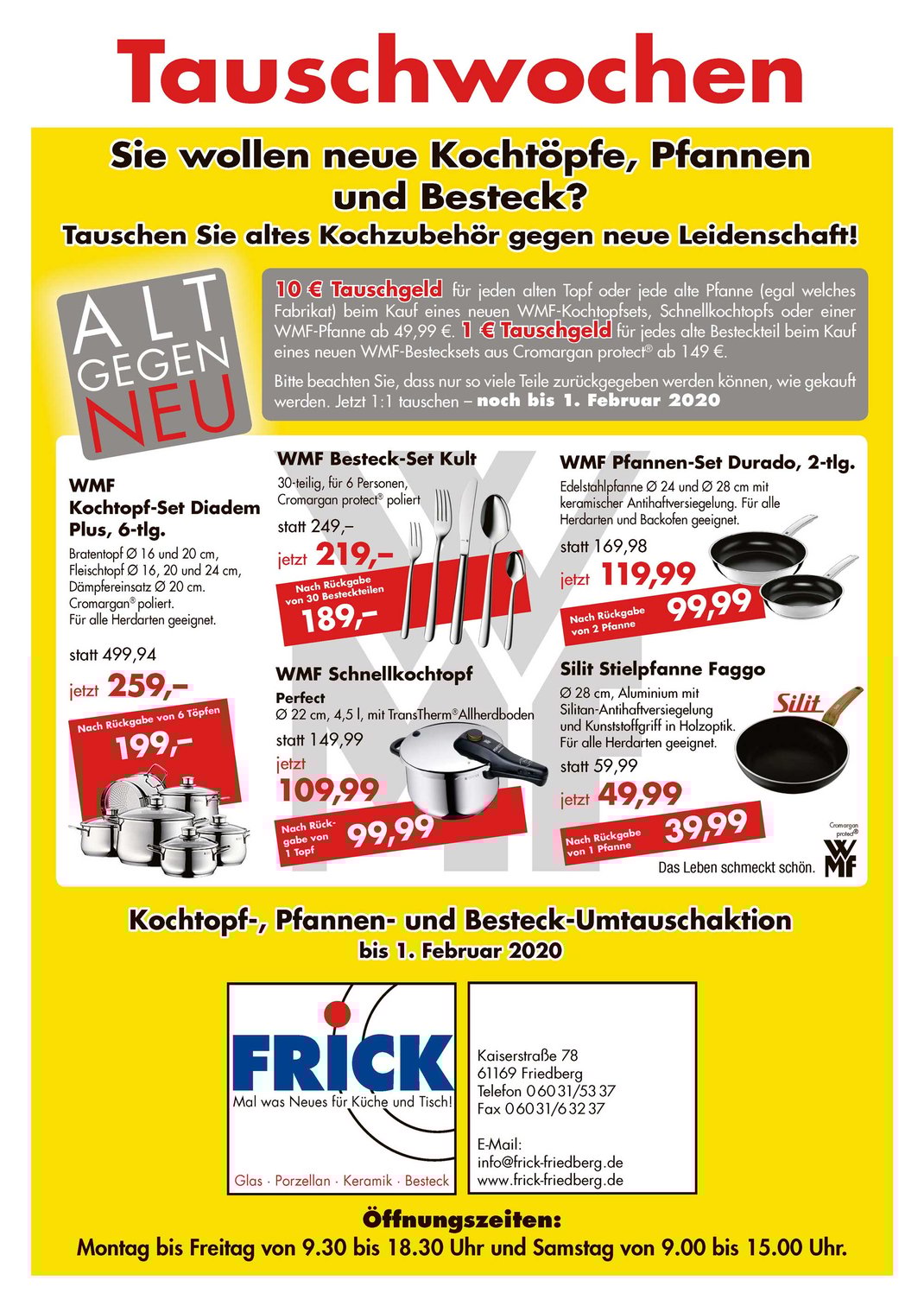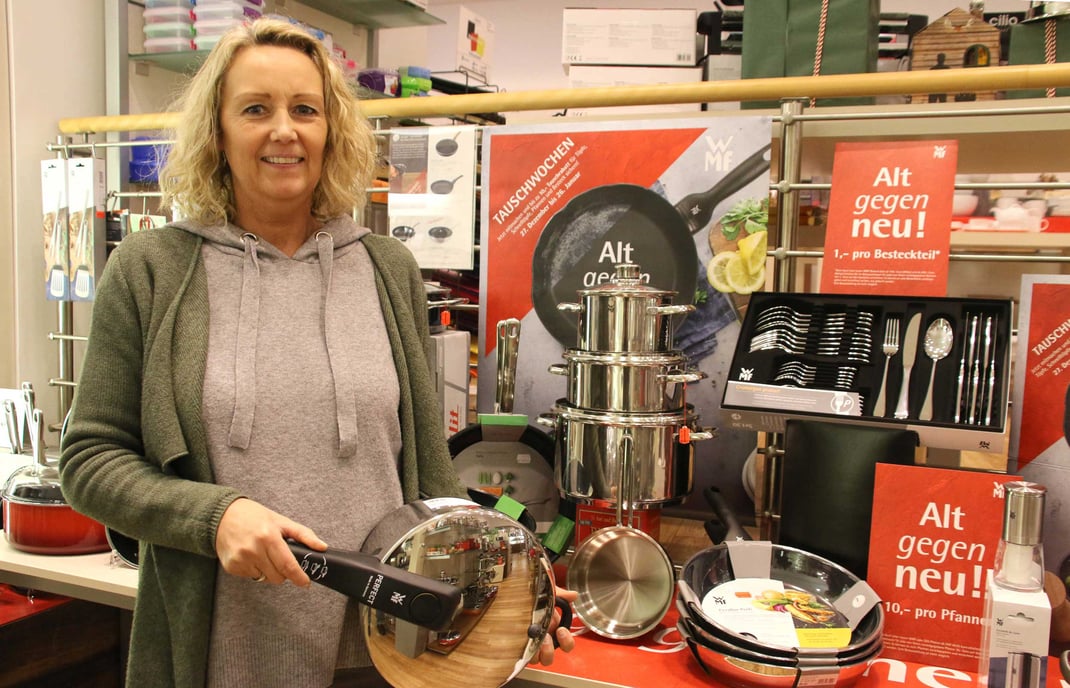 Jedes Jahr nach Weihnachten beginnen im Porzellanhaus Frick auf der Kaiserstraße 78 die traditionellen Tauschwochen von WMF und Silit. Bis einschließlich 26. Januar erhalten die Kunden unter dem Aktionsmotto „Tausche altes Kochzubehör gegen neue Leidenschaft“ beim Kauf von Kochgeschirr, Schnellkochtöpfen oder Pfannen der renommierten Hersteller WMF und Silit eine Gutschrift von zehn Euro pro Stück, wenn diese ihren alten Topf, Schnellkochtopf oder Pfanne mitbringen und abgeben.